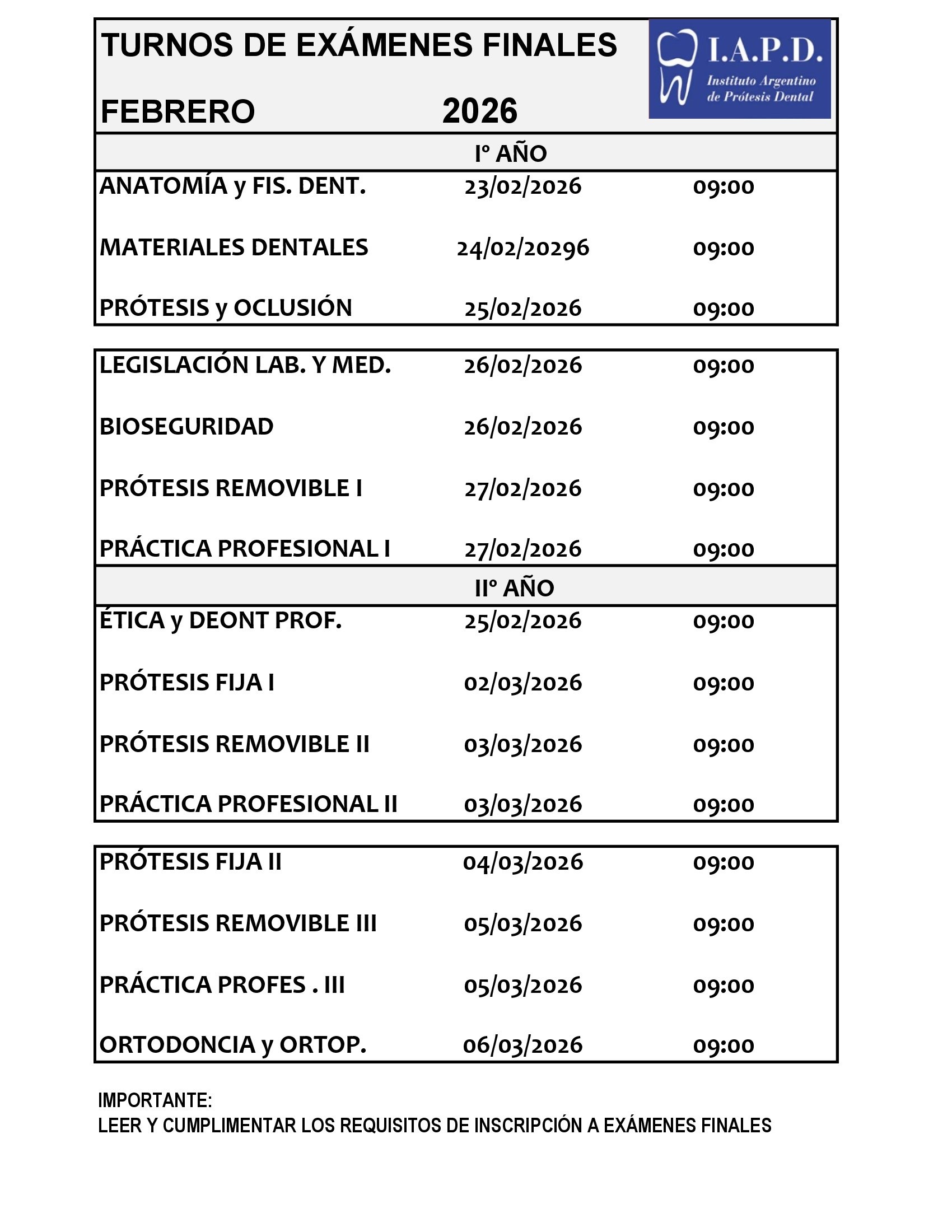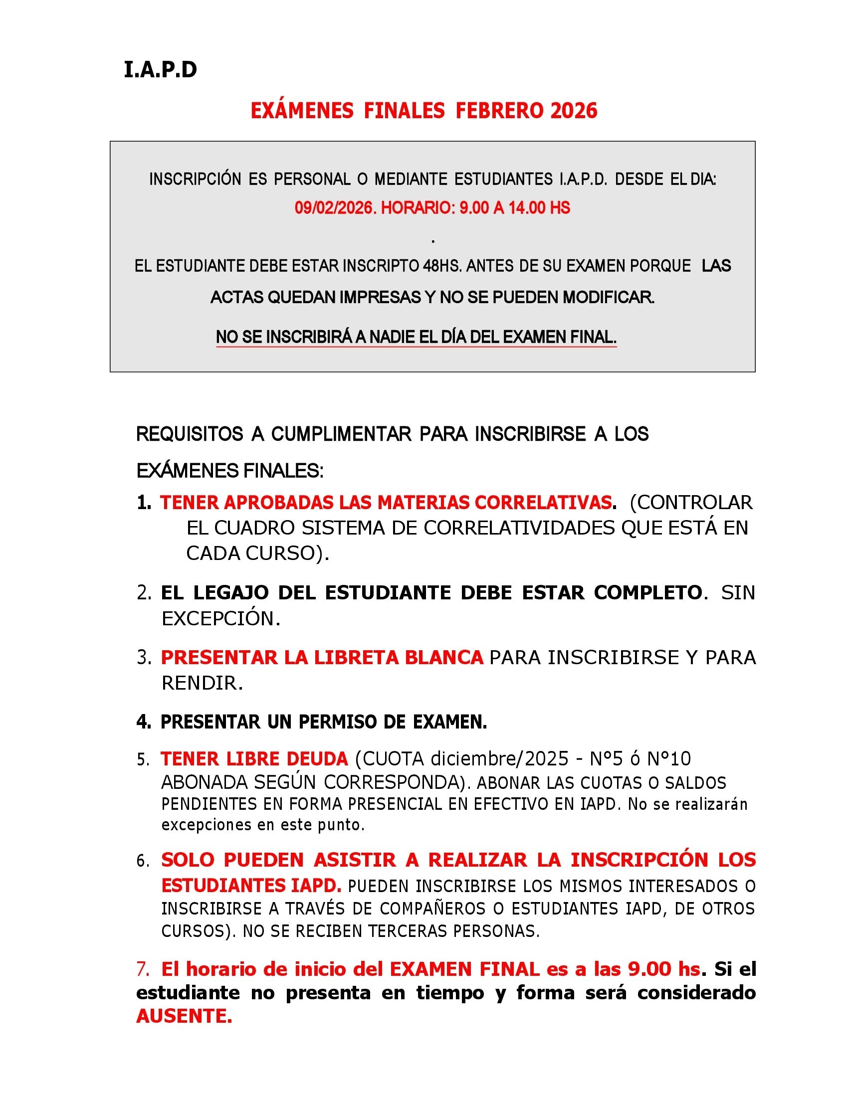 A continuación encontrarán lasActas Definitivas registradas en Libro de Examen Final Diciembre 2025. Si Ud. no figura en Acta es porque no cumplimentó en tiempo y forma alguno de los requisitos establecidos por IAPD. Todos los estudiantes que tengan materias pendientes de 1°C deberán presentarse en los próximos turnos de manera presencial e inscribirse en IAPD, presencialmente o mediante compañeros. El plazo de inscripción vence 48 hs. antes del examen. Para el turno de FEBRERO 2026, ya están abiertas las inscripciones. Cualquier duda comunicarse con secretaría personalmente de 9.00 a 14.00 de lunes a viernes.